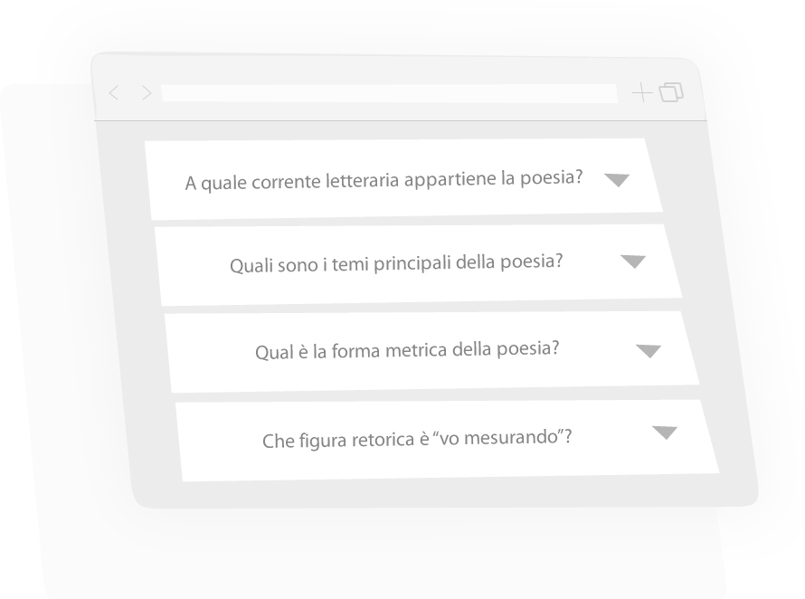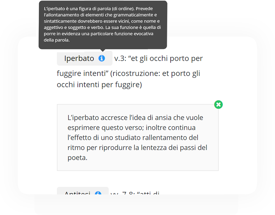 Troverai tutte le figure retoriche di ogni poesia segnalate verso per verso e spiegate nel dettaglio in modo da non lasciarti nessun dubbio.